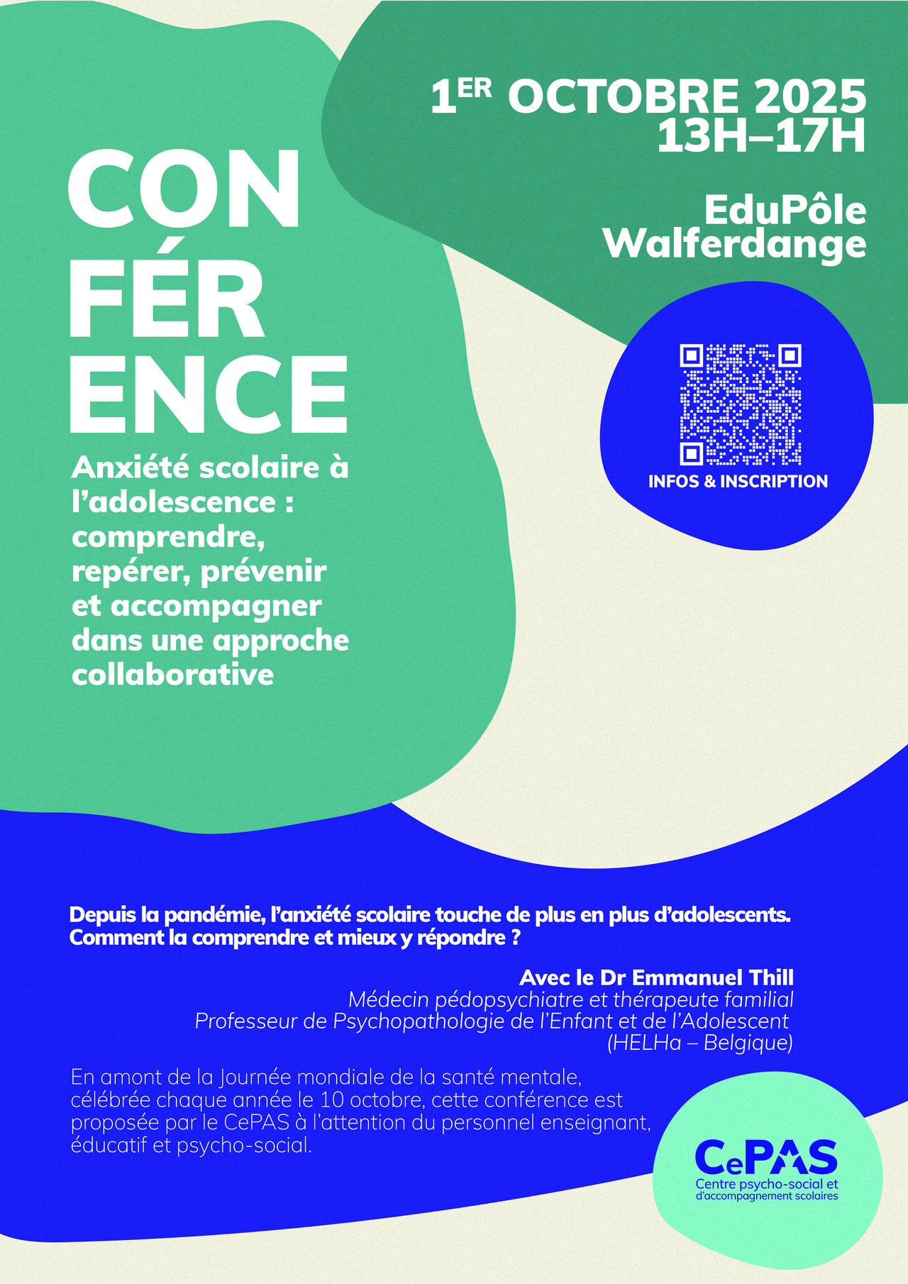 Animée par le Dr Thill, pédopsychiatre, cette conférence abordera les formes d’anxiété scolaire, leurs dynamiques et leurs impacts, tout en proposant des outils concrets pour le repérage, la prévention et l’accompagnement au lycée de ces jeunes en repli social. Cette conférence, qui se veut interactive et réflexive, s’adresse aux professionnels du monde scolaire, et à tout professionnel concerné par la santé mentale des adolescents.